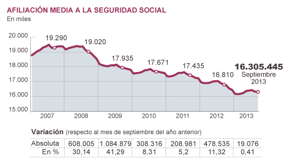 La afiliación a la Seguridad Social sí da cuenta de la evolución del empleo con bastante precisión. Y aquí el cambio de tendencia aún está lejos. En la comparación anual, la afiliación es un 3% inferior a la de hace un año. En 2010 o 2011, por ejemplo, se estaba mucho más cerca de una creación de empleo “neta”, algo que el propio Gobierno no espera hasta la segunda mitad de 2014.