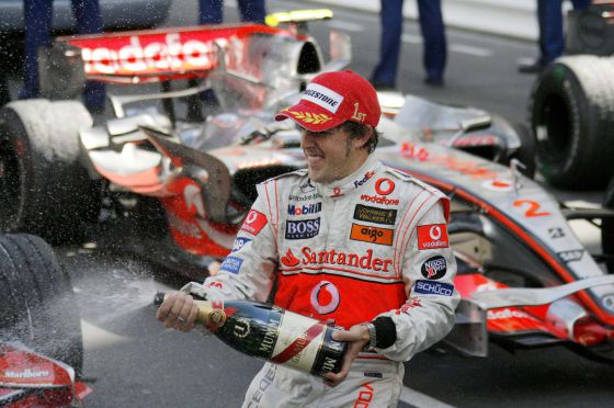 Fernando Alonso, con el escudo del McLaren-Mercedes, celebra su victoria en el Gran Premio de Monte Carlo, en 2007
