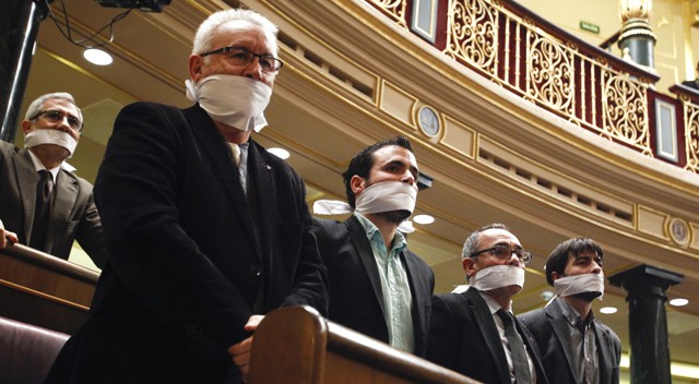 "Esta ley no es necesaria, viola la jurisprudencia europea y el convenio europeo de derechos humanos y recorta derechos fundamentales como el de manifestación y el de reunión", ha resumido Toni Cantó (UPyD). "Hoy vivimos una jornada infausta para la democracia con la aprobación de esta ley", ha remachado Ricardo Sixto (Izquierda Plural), mientras sus compañeros de grupo protestaban desde su escaño en pie y con una mordaza en la boca.