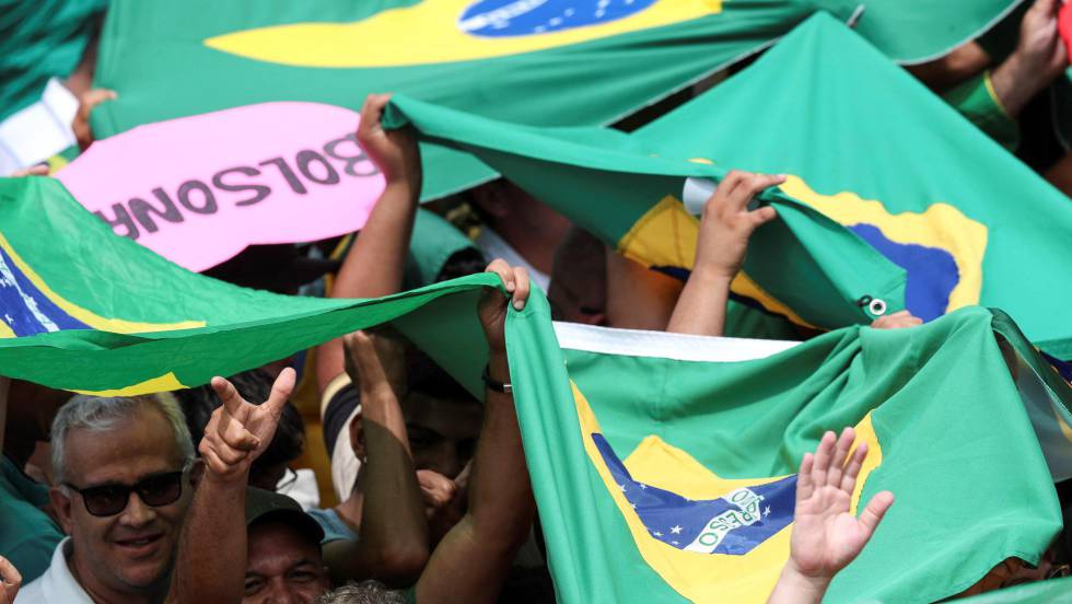 Comienza así un nuevo mandato en el país más habitado y la mayor economía de Latinoamérica marcado por una agenda con medidas de extrema derecha tras 13 años de gobiernos de centroizquierda y dos de transición de Michel Temer. Bolsonaro fue elegido el 28 de octubre en segunda vuelta por 58 millones de brasileños (el 55%) y llega al poder con un 75% de aprobación de sus medidas, según una encuesta del instituto Ibope. El flamante presidente ha optado por una presencia de militares para su Ejecutivo: de sus 22 ministros, siete o bien son exmilitares o tuvieron formación en el Ejército. Con un desempleo del 11,6%, Brasil aún se recupera de dos años de recesión y un crecimiento del PIB en 2018 de poco más del 1,3%. “El pueblo me eligió porque quiere menos Estado y más mercado”, ha repetido Bolsonaro como mantra.