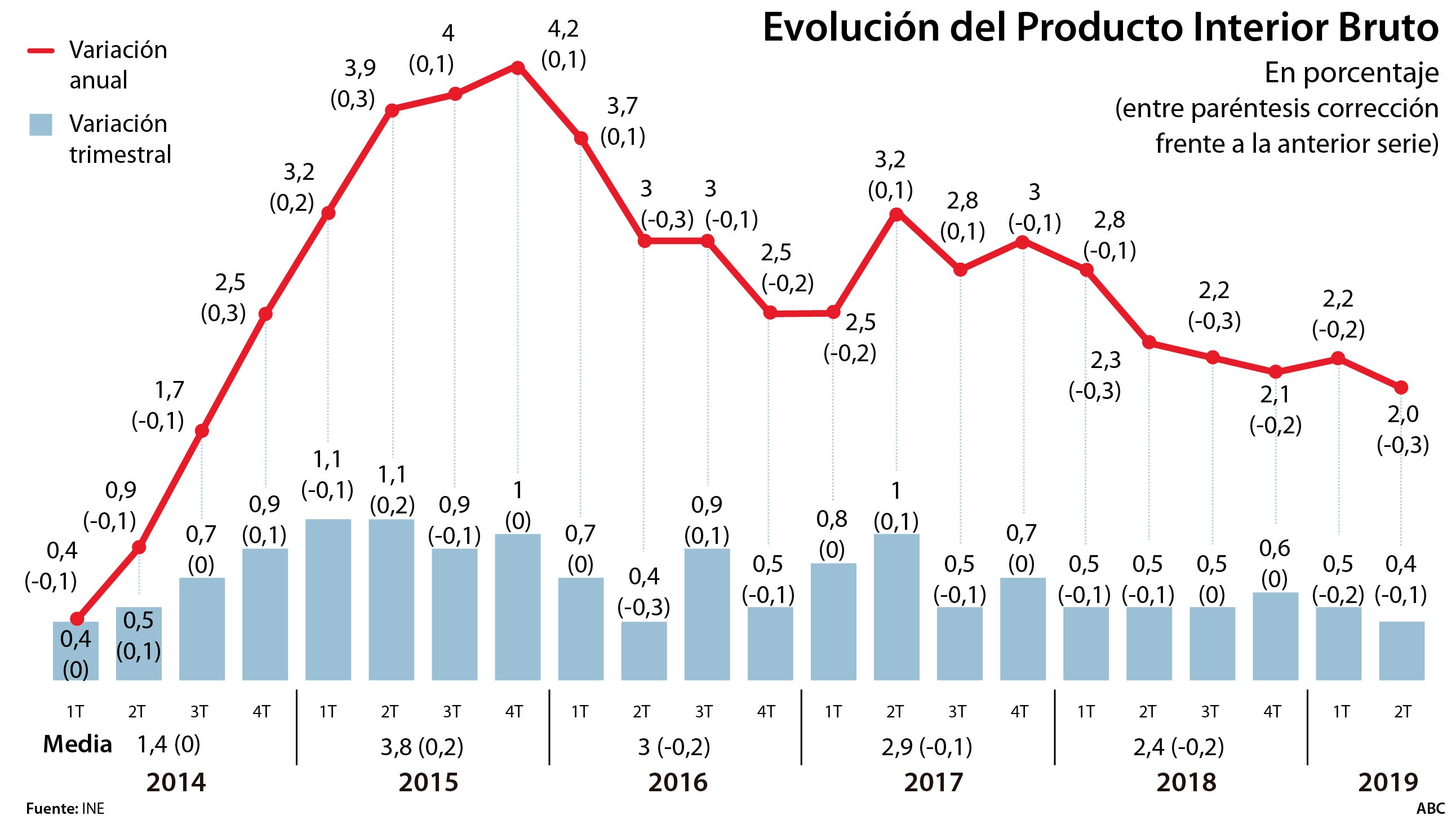 La historia de la recuperación de la economía no había sido tal y como se había venido contando: el PIB tenía ahora un peso 6.055 millones menor y con casi 500.000 empleos menos. Esta nueva revisión redujo el crecimiento de 2019: en el primer trimestre no se creció un 0,7% como se dijo en un inicio, sino un 0,5%; en el segundo, fue un 0,4% y no el 0,5% que se anunció en un inicio. Y en 2018 se creció un 2,4% –dos décimas menos que lo que se publicó inicialmente–, en 2017, un 2,9% –una décima menos– y en 2016, un 3% –dos décimas a la baja– mientras que en 2015 la recuperación fue mucho mayor: el PIB avanzó un 3,8%, frente al 3,6% que se pensó en un inicio. En la nueva serie resulta que se creció algo menos en los años del «boom», la crisis fue más intensa de lo calculado en su momento, y que la recuperación fue mayor pero la desaceleración, también.