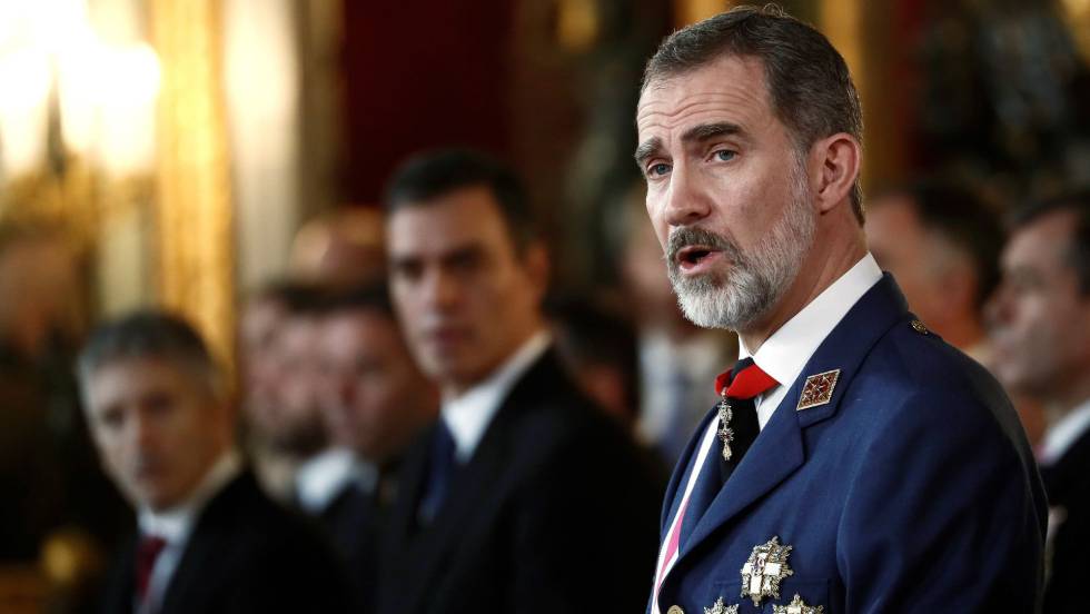 En presencia del presidente en funciones, Pedro Sánchez, y de los ministros de Defensa e Interior, Margarita Robles y Fernando Grande-Marlaska, Felipe VI se ha dirigido en el salón del trono del Palacio Real a unos 150 militares de los tres ejércitos y la Guardia Civil, a quienes ha expresado su “más sincero orgullo y reconocimiento, por el impecable desempeño” de sus cometidos. “Sabéis mejor que nadie que garantizar la libertad y la seguridad de los españoles es una misión fundamental para el desarrollo y bienestar de nuestro país”, les ha dicho.