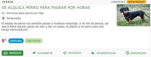 Esta autorización que no está reflejada de forma expresa en el decreto del estado de alarma ha dado lugar a un turbio negocio: personas ofreciendo sus mascotas para saltarse la obligación de permanecer en los domicilios. Así, cobran desde un euro, diez hasta llegar a los 25 euros. Los anuncios, muchos de ellos, invitan a saltarse la prohibición de salir de los domicilios con sarcasmo.