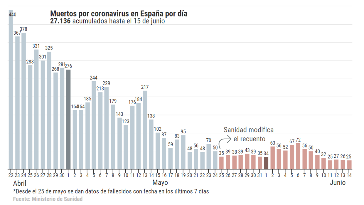 17.47La cifra total de fallecidos sigue «congelada»Sanidad sigue sin actualizar el balance total de fallecidos por coronavirus, que se mantiene desde hace más de una semana en 27.136 decesos. Desde el ministerio han explicado en más de una ocasión que están ajustando los datos con las comunidades autónomas para poder ofrecer una información más veraz. Esta actualización, sin embargo, se anunció para hace diez días.